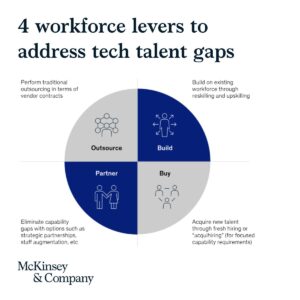 هیچ راه حل جادویی برای کمبود استعداد فعلی وجود نخواهد داشت. در عوض، شرکتها باید به طور جامع به این موضوع بپردازند. با انجام این کار، آنها میتوانند از چهار اهرم جداگانه استفاده کنند (شکل).