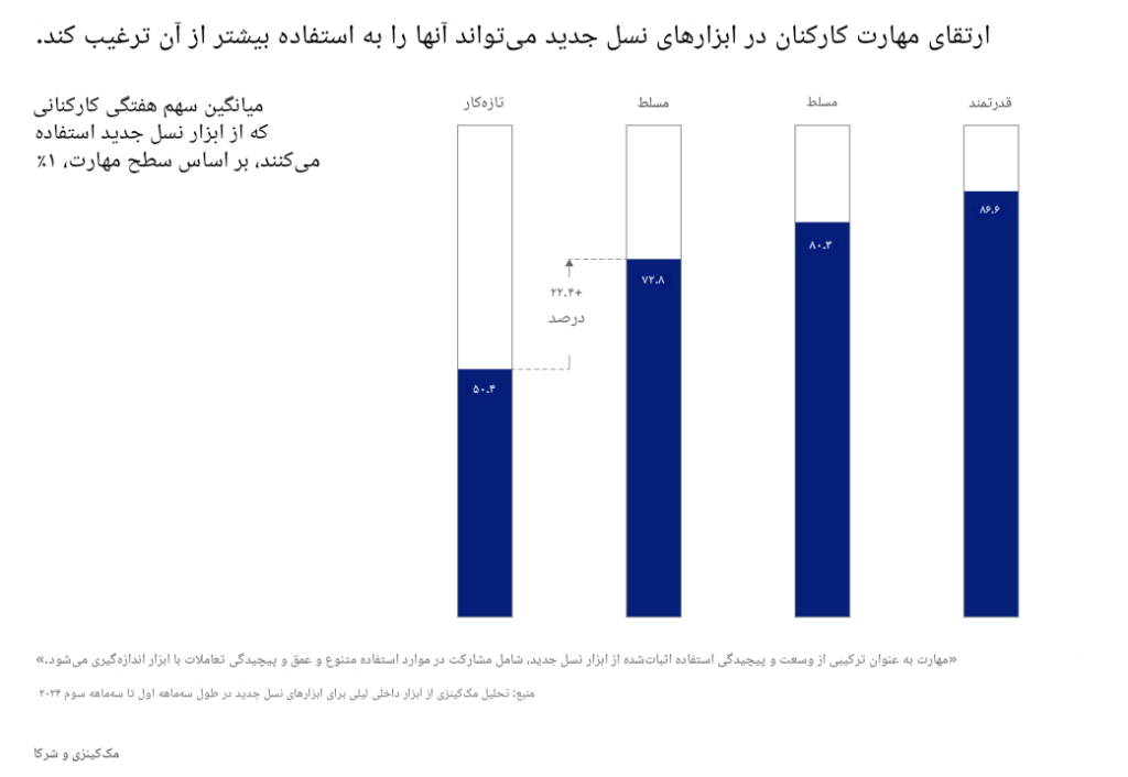 هنگامی که جریانهای کاری توسط هوش مصنوعی نسل جدید تقویت میشوند، کارمندان به آموزش رسمی در مورد نحوه استفاده از آنها نیاز دارند که به کاهش اضطراب کارمندان کمک میکند و اعتماد به نفس آنها را برای انجام کار به روشهای جدید افزایش میدهد. هنگامی که کارمندان آموزش کافی در مورد ابزارهای هوش مصنوعی نسل جدید دریافت میکنند، با افزایش سطح مهارت خود، از ابزارها بیشتر و بیشتر استفاده میکنند (شکل ۲). علاوه بر این، تحقیقات ما نشان میدهد که ۴۸ درصد از کارمندان آمریکایی در صورت دریافت آموزش رسمی، بیشتر از ابزارهای هوش مصنوعی نسل جدید استفاده میکنند و ۴۵ درصد در صورت ادغام ابزارهای هوش مصنوعی نسل جدید در جریانهای کاری روزانه خود، بیشتر از آنها استفاده میکنند – و این دو عامل را به عنوان انگیزهبخشترین عوامل ذکر میکنند.